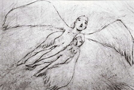 A couple of winged beings make love and fly away. They bear a child in an egg, and when the child opens its eyes they are immediately destroyed, one consumed by fire and the other by water.